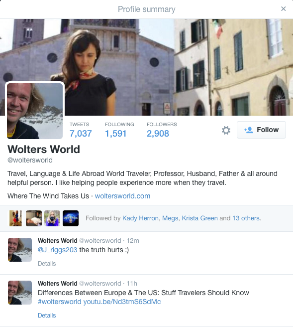 Additionally, Wolters creates YouTube videos about travel, which his students are required to watch, and are then tested on. Wolters says these videos allow students who don’t come to class the chance to learn. “Even though they don’t come, I still want them to learn,” he says.