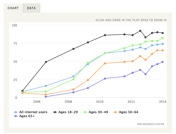 Over the past decade, social media has exploded. It provides many social benefits, as well as advertising and business strategies. According to Pew Research Center’s Internet & American Life Project, 89 percent of adults ages 18-29 use social media sites, whereas for adults ages 65 and older, only about 49 percent of them use social networking sites.